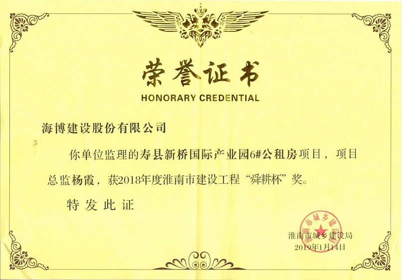 日前,淮南市城鄉(xiāng)建設(shè)局公布了2018年度淮南市建設(shè)工程優(yōu)質(zhì)工程獎(jiǎng)名單,我司承擔(dān)監(jiān)理的壽縣國際產(chǎn)業(yè)園6#公租房項(xiàng)目喜獲2018年度淮南市建設(shè)工程“舜耕杯”獎(jiǎng)。 該項(xiàng)目位于壽縣新橋國...