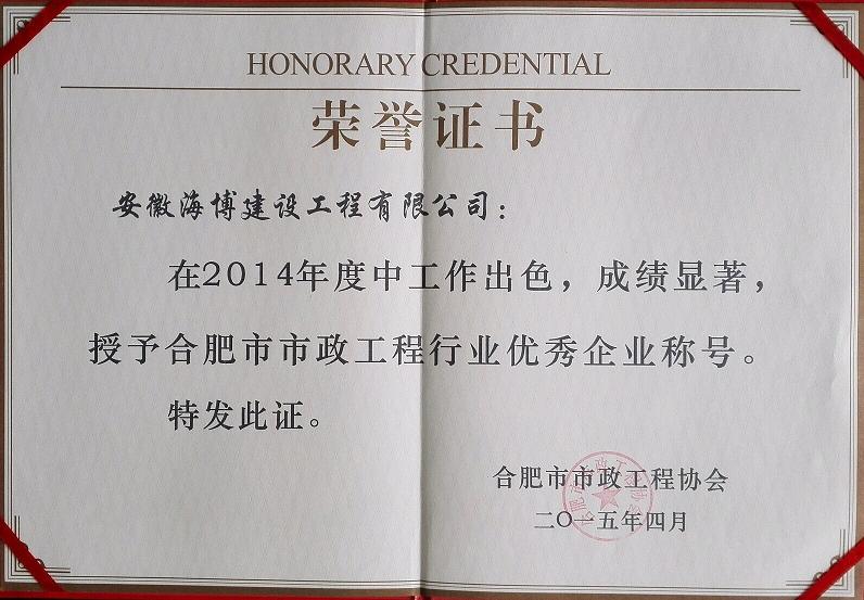 我公司一直致力于誠信發展、注重工程質量、確保安全生產,被協會評為“合肥市市政工程行業優秀企業”;同時,經過協會提議,全體會員表決,我公司順利晉升為副會長單位。