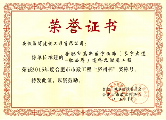 炎炎夏日,驕陽似火,我公司喜獲2015年度合肥市市政工程“廬州杯”獎(jiǎng),給酷熱的盛夏送來了陣陣涼意。由公司承建的合肥市高新區(qū)寧西路(長(zhǎng)寧大道-肥西界)道橋及附屬工程經(jīng)合肥市城鄉(xiāng)建設(shè)委員會(huì)及合肥市市政工程協(xié)會(huì)審定,順利獲得此次獎(jiǎng)項(xiàng)。