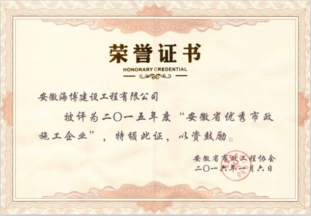 2015年度“安徽省優(yōu)秀市政施工企業(yè)”評選結(jié)果于近日揭曉,此次全省共評選出40家優(yōu)秀市政施工企業(yè),熱烈祝賀安徽海博建設(shè)工程有限公司位列其中。