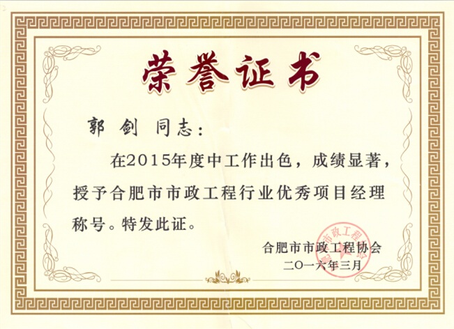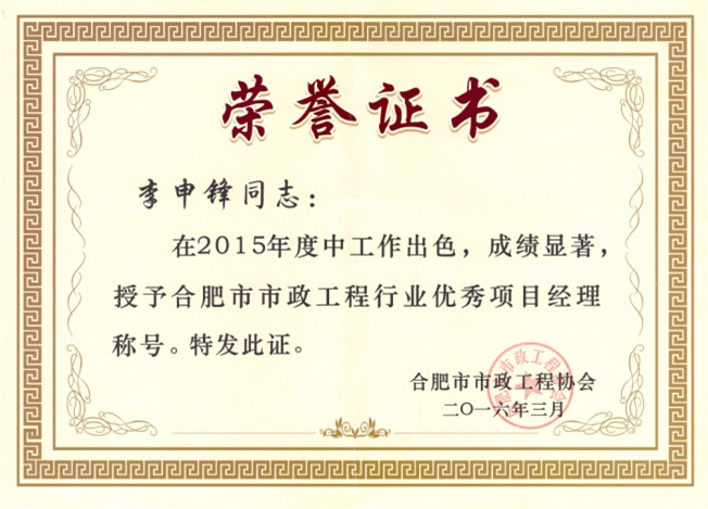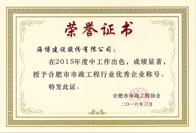 合肥市市政工程協(xié)會第三屆三次理事大會于昨日召開,會上對2015年度評選出的合肥市市政工程“優(yōu)秀企業(yè)”和“優(yōu)秀項目經(jīng)理”進行表彰,海博建設股份有限公司榜上有名,并且我司李申鋒、郭劍兩位同志也榮獲“優(yōu)秀項目經(jīng)理”稱號。