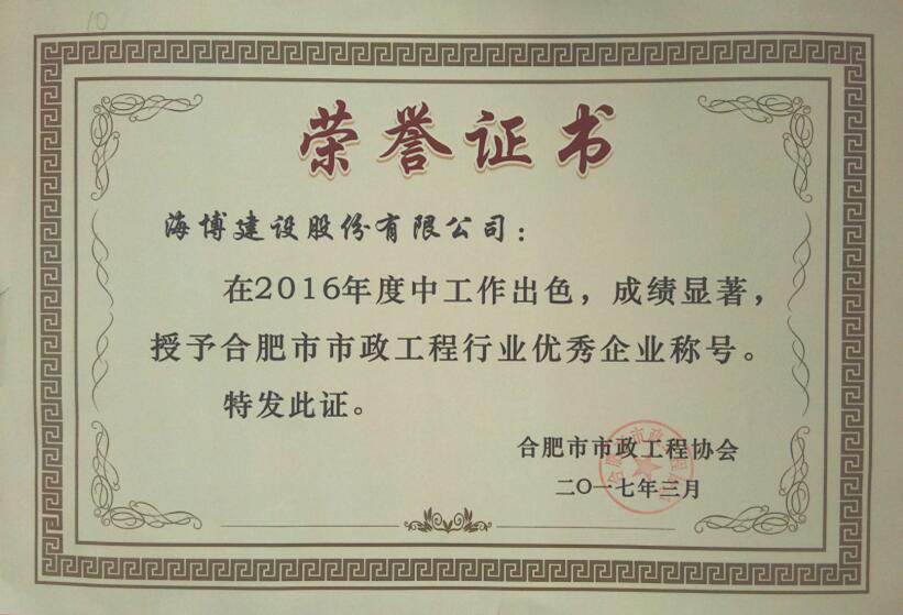 我公司榮獲“2016年度合肥市市政工程優秀企業”稱號
