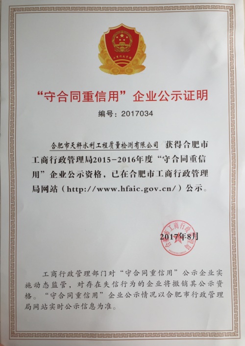 近日,合肥市工商行政管理局頒發了市級守合同重信用公示證書,合肥市天秤水利工程質量檢測有限公司首次申報并獲得此項殊榮。