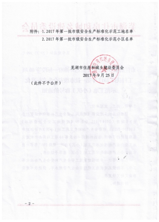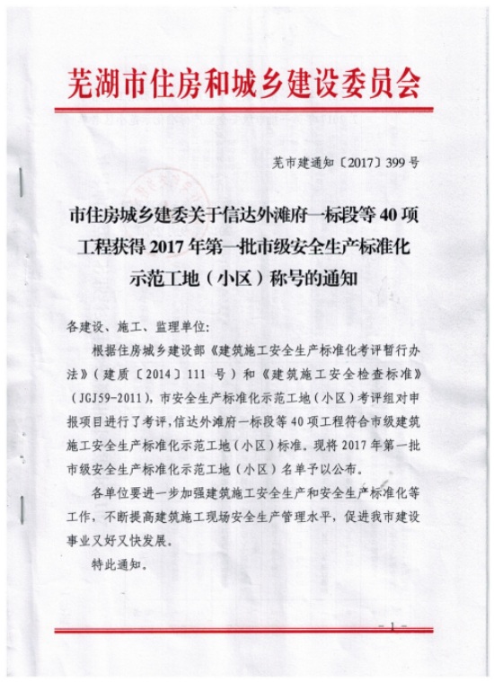 近日,經(jīng)蕪湖市安全辦領(lǐng)導(dǎo)、專家組成的安全標準化評審組嚴格、認真地評審,我公司無為縣城東工業(yè)園區(qū)福東北路(緯一路-福貿(mào)路)工程獲得2017年第一批市級安全生產(chǎn)標準化示范工地稱號,也是蕪湖市目前唯一獲得該稱號的市政道路工程。