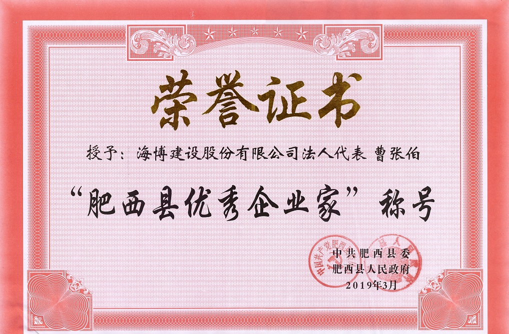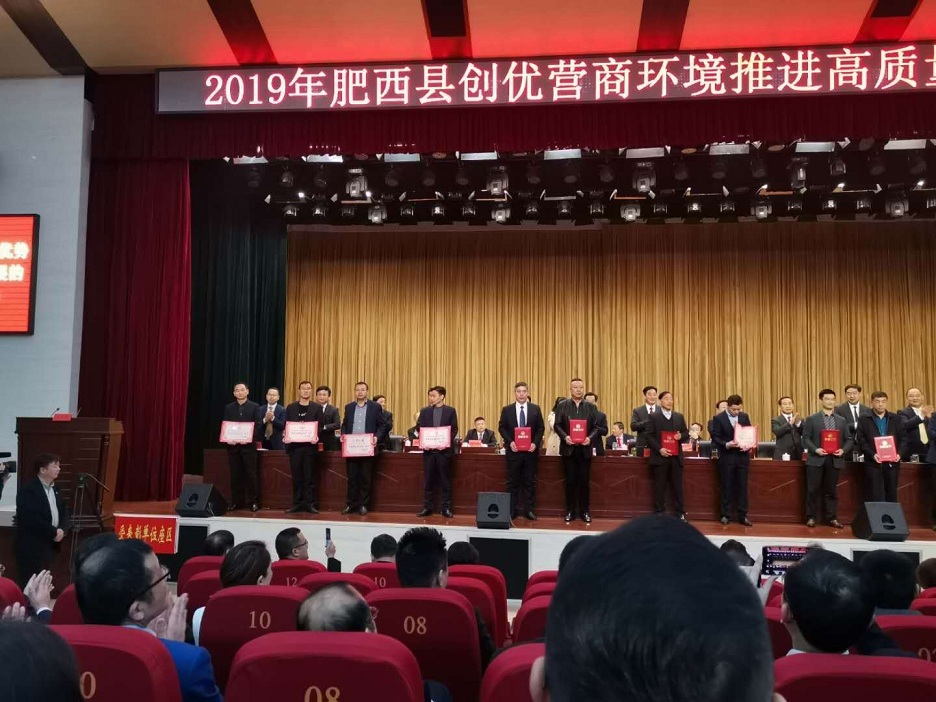 2019年3月30上午9:00整,肥西縣創(chuàng)優(yōu)營(yíng)商環(huán)境推進(jìn)高質(zhì)量發(fā)展大會(huì)在縣政府派河劇場(chǎng)隆重召開,并舉行了“肥西縣優(yōu)秀企業(yè)”、“優(yōu)秀企業(yè)家”頒獎(jiǎng)典禮。集團(tuán)公司董事長(zhǎng)曹張伯先生獲“肥西縣優(yōu)秀企業(yè)家”榮譽(yù)稱號(hào)。