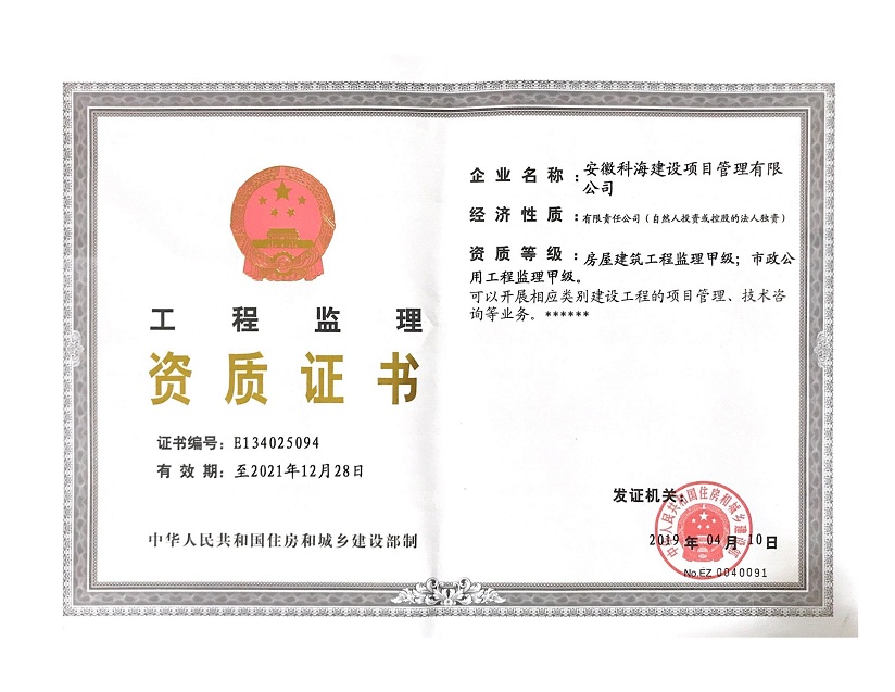 安徽科海建設(shè)項目管理有限公司現(xiàn)有國家級監(jiān)理資質(zhì)為:水利工程施工監(jiān)理甲級、房屋建筑工程監(jiān)理甲級、市政公用工程監(jiān)理甲級。